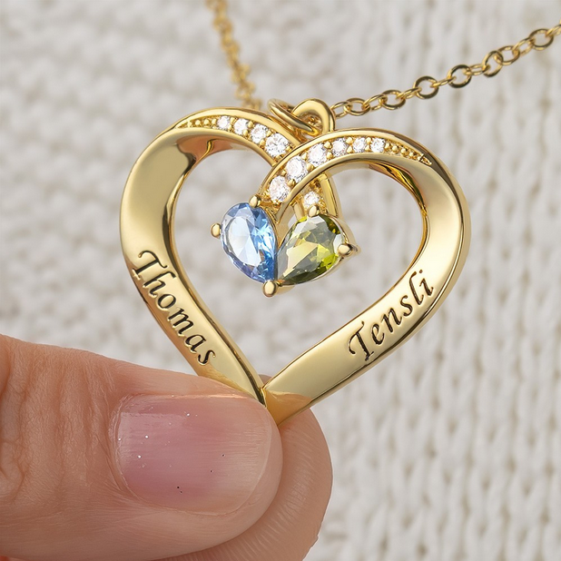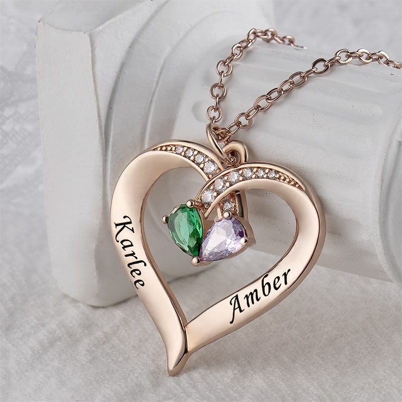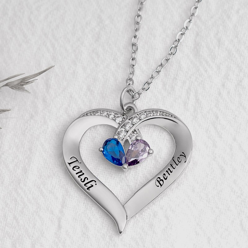Collier personnalisé de noms de couple de coeur avec des cadeaux de Saint-Valentin de pierres de naissance
